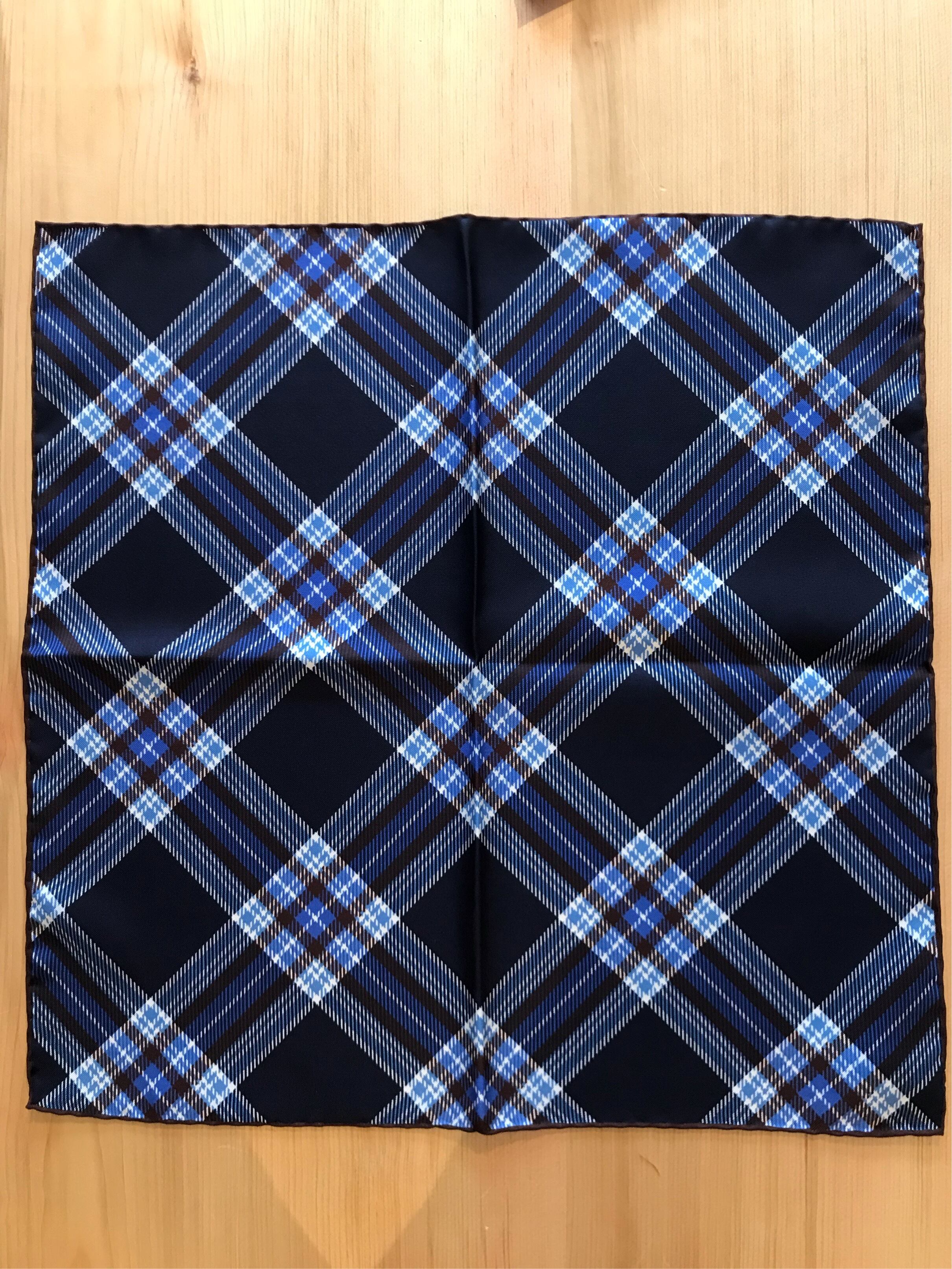 英国出張の際に別注をかけたのは、 高級絹織物の産地として名高いマックルズフィールドの プリンテッド・シルク・メーカーADAMLEY DAVID EVANS & CO.。 シルクのなめらかな質感とハンドプリントによって描きだされる柔和 なパターンが胸元に華を添えます。 size:40cm×40cm